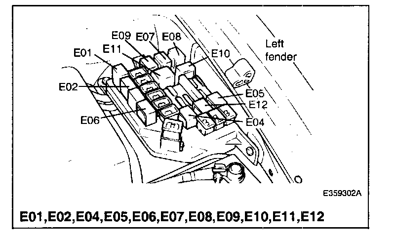 E01 Pre-excitation resistor, E02 DRL relay, E04 Start relay, E05 Condenser fan relay, E06 Head lamp relay, E07 Radiator fan relay, E08 A/C relay, E09 Front fog lamp relay, E10 Tail lamp relay, E11 Blower relay, E12 Horn relay:
