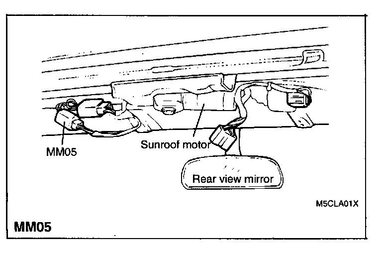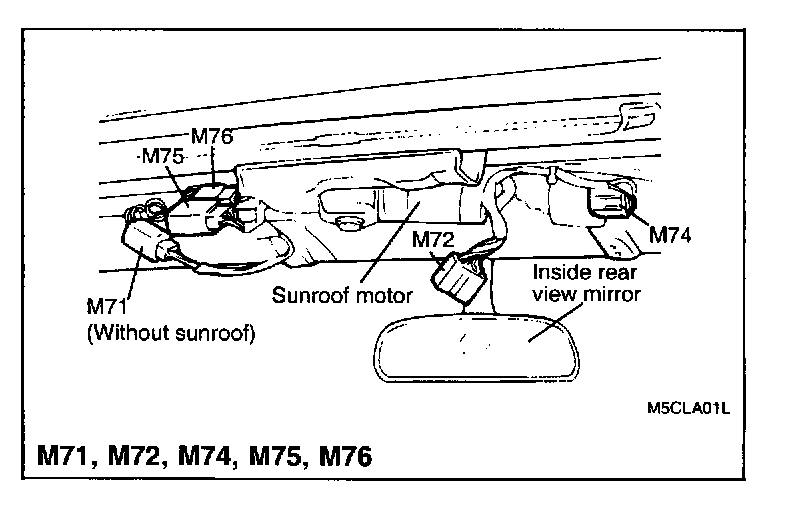 M71 Map lamps, M72 Room lamp, M74 Right sunroof relay (Close/Tilt up), M75 Sunroof motor, M76 Left sunroof relay (Open/Tilt down):