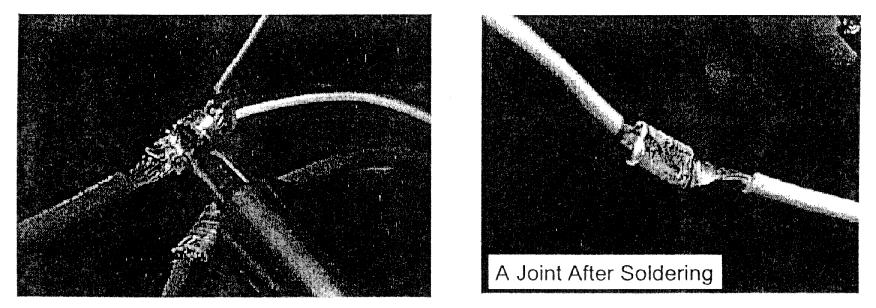 14. Quickly feed enough rosin-core solder wire to achieve an even, moderate thickness coat of solder over the joint. Once the solder begins to flow, the soldering process will be completed in a few seconds.