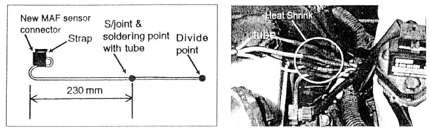 4. Remove the plastic protective tube from the MAF sensor connector wiring harness and set aside for later use. Cut the MAF sensor connector wiring at approximately 1" (25 mm) from the end of the connector. Discard the removed connector.
