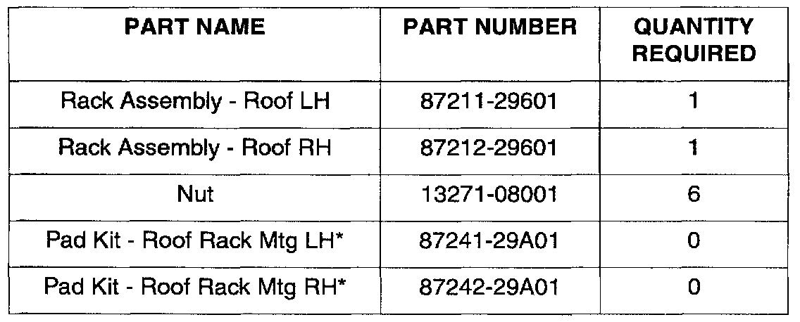 NOTE: *Roof Rack Mounting Pad Kits are included with each Roof Rack Assembly