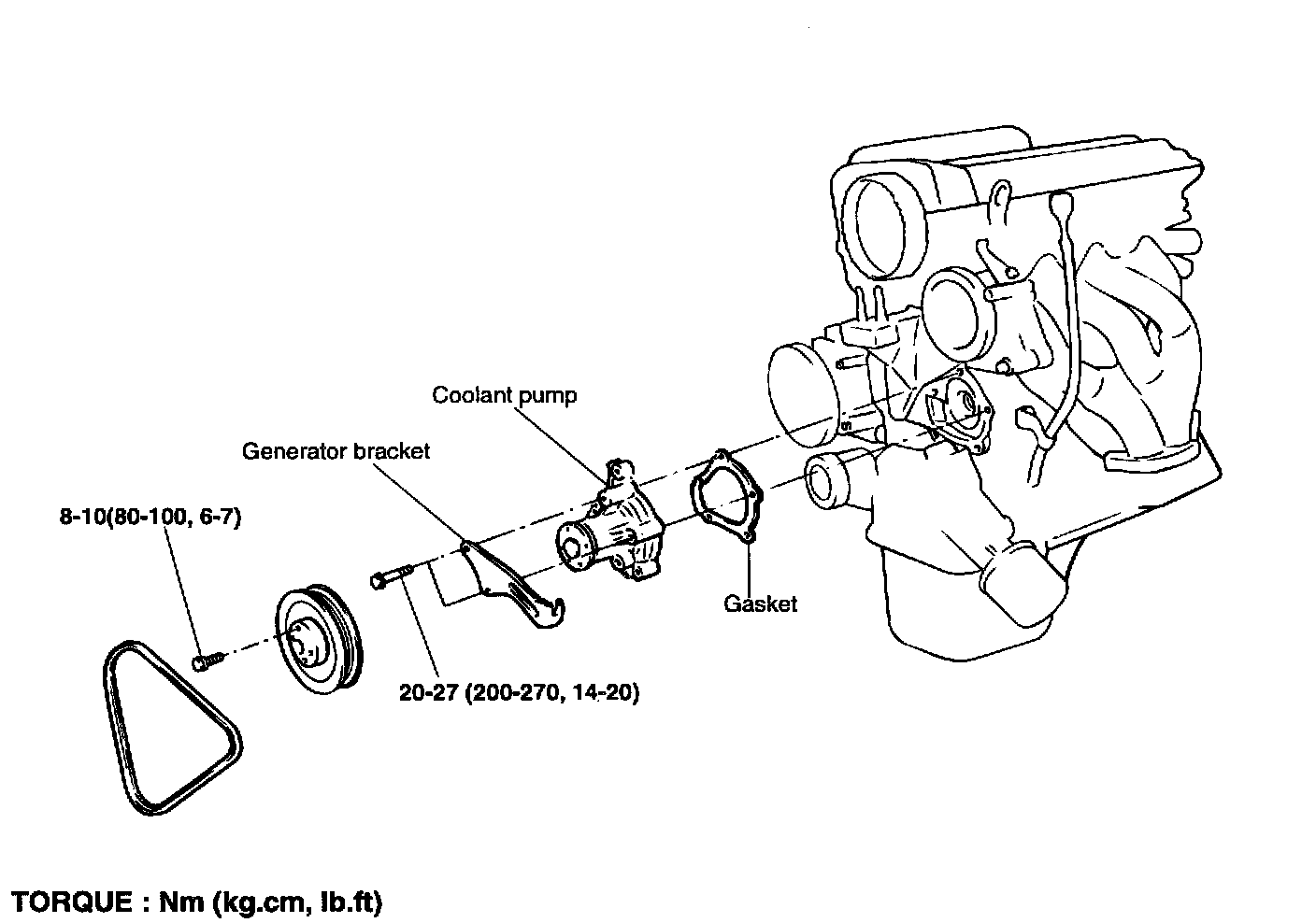Coolant pump to cylinder block: 20-27 Nm (200-270 kgf-cm, 14-20 ft. lbs.)