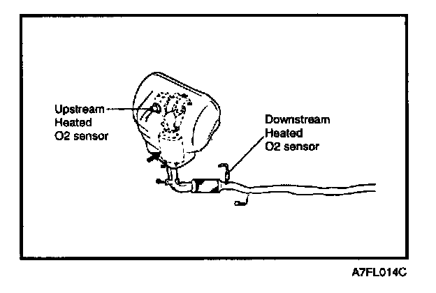 The heated oxygen senor senses the oxygen concentration in the exhaust gas and, converts it into a voltage which is sent to the ECM. The heated oxygen sensor outputs about 800 mV when the air fuel ratio is richer than the theoretical ratio and outputs about 100 mV when the ratio is leaner (higher oxygen concentration in exhaust gas.) The ECM controls the fuel injection ratio based on this signal so that the air fuel ratio is maintained at the theoretical ratio. The oxygen sensor has a heater element which ensures the sensor performance during all driving condition.