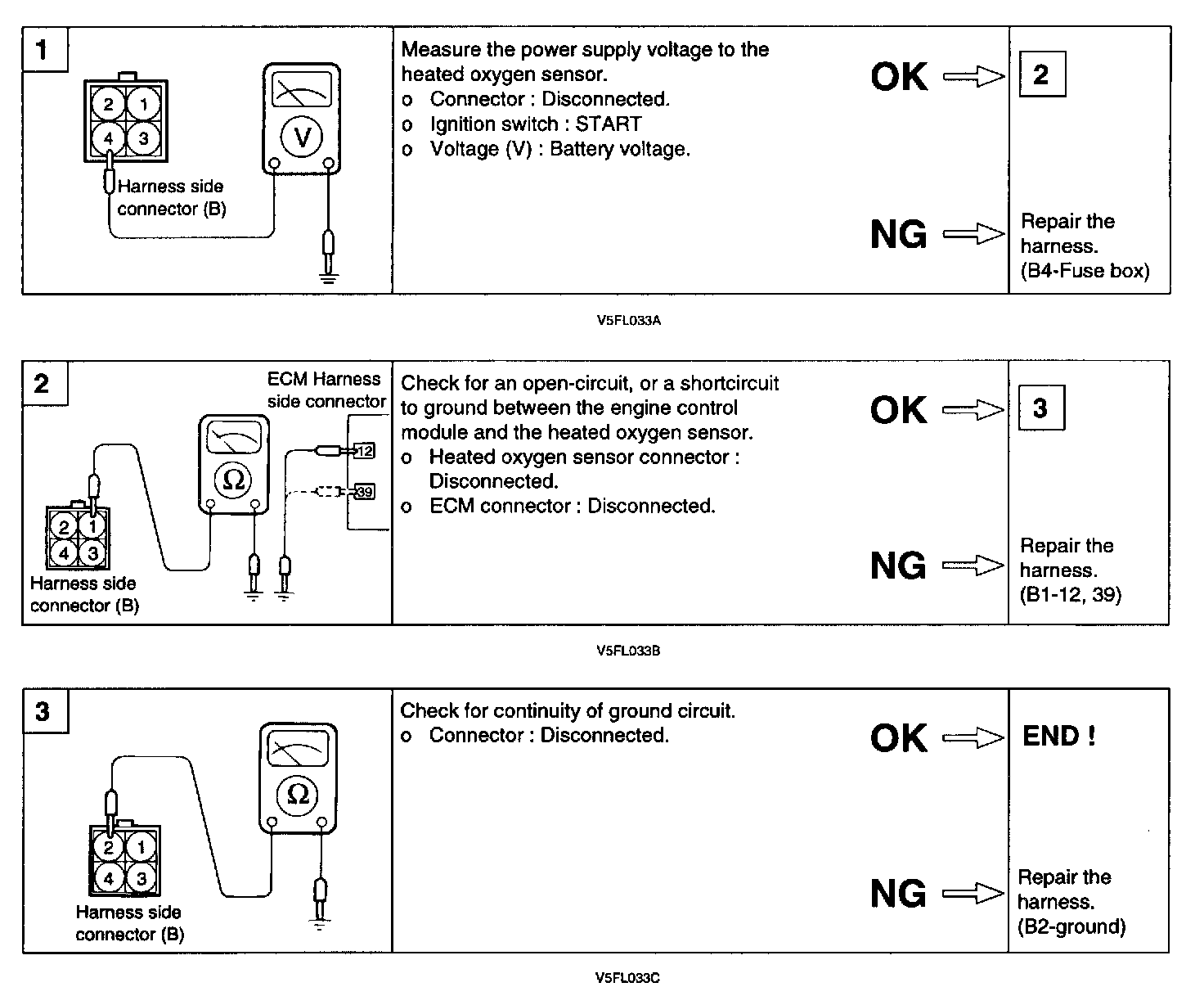1. Disconnect the heated oxygen sensor connector, and measure the resistance between terminal 3 and terminal 4.