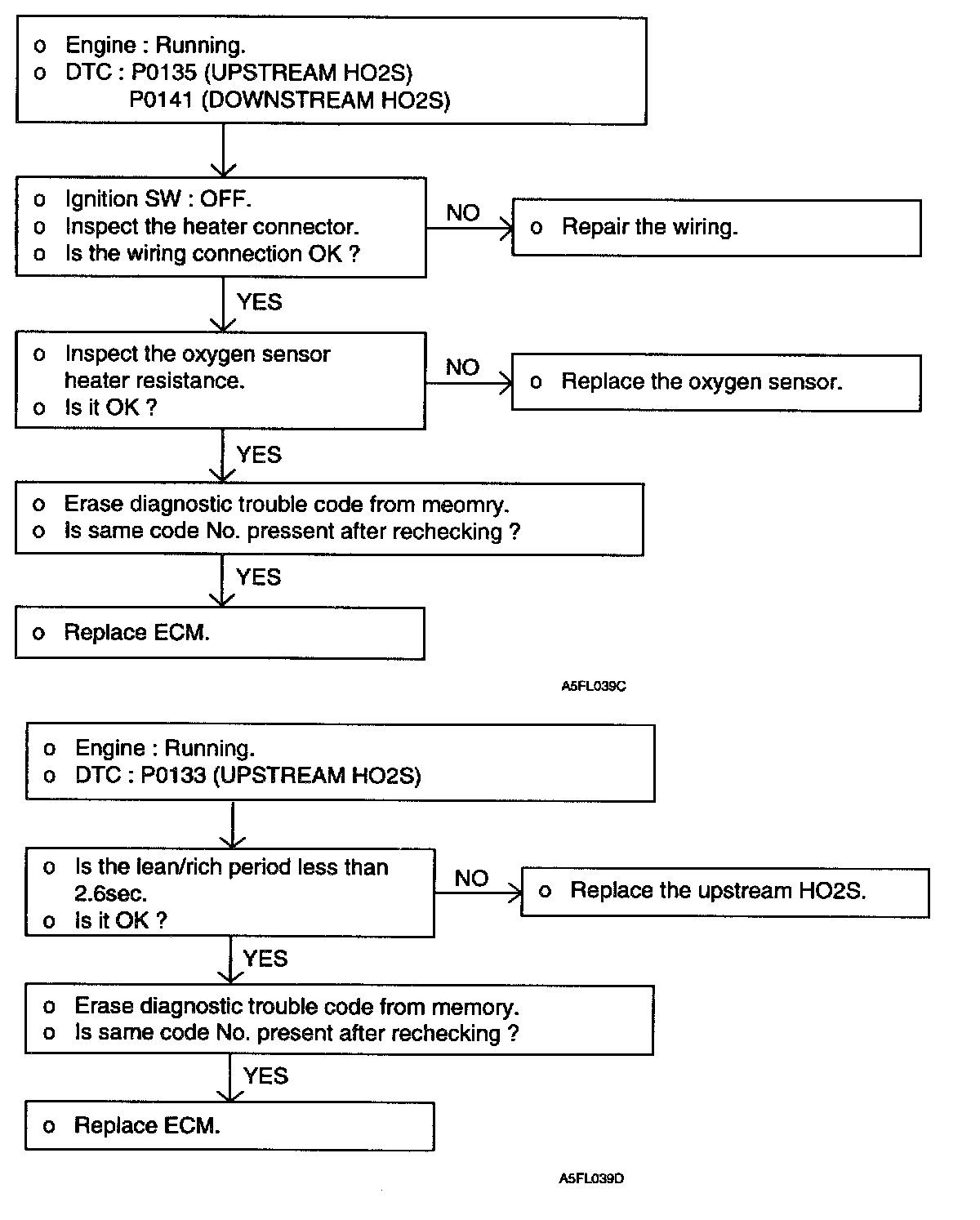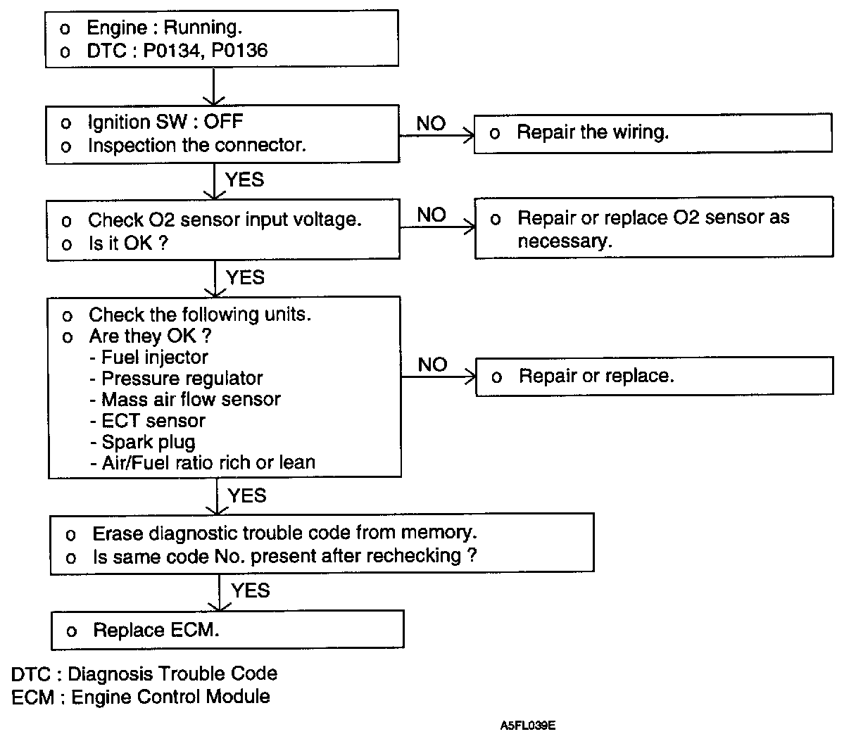 2. If the heated oxygen sensor check has been normal, but the sensor output voltage is out of specification, check the following items related to the air fuel ratio control system.