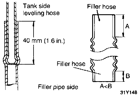 2. Connect the leveling hose to the tank and approximately 40 mm (1.6 in.) at the filler neck.