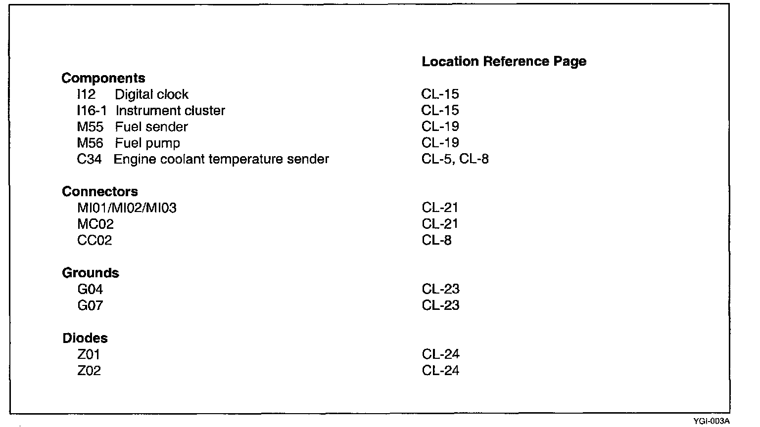 When you want to locate the schematic components on the vehicle, use the Component Location Index which follows each schematic. A Component Location Index lists major components, connectors, grounds, diodes, and their physical location and page reference.