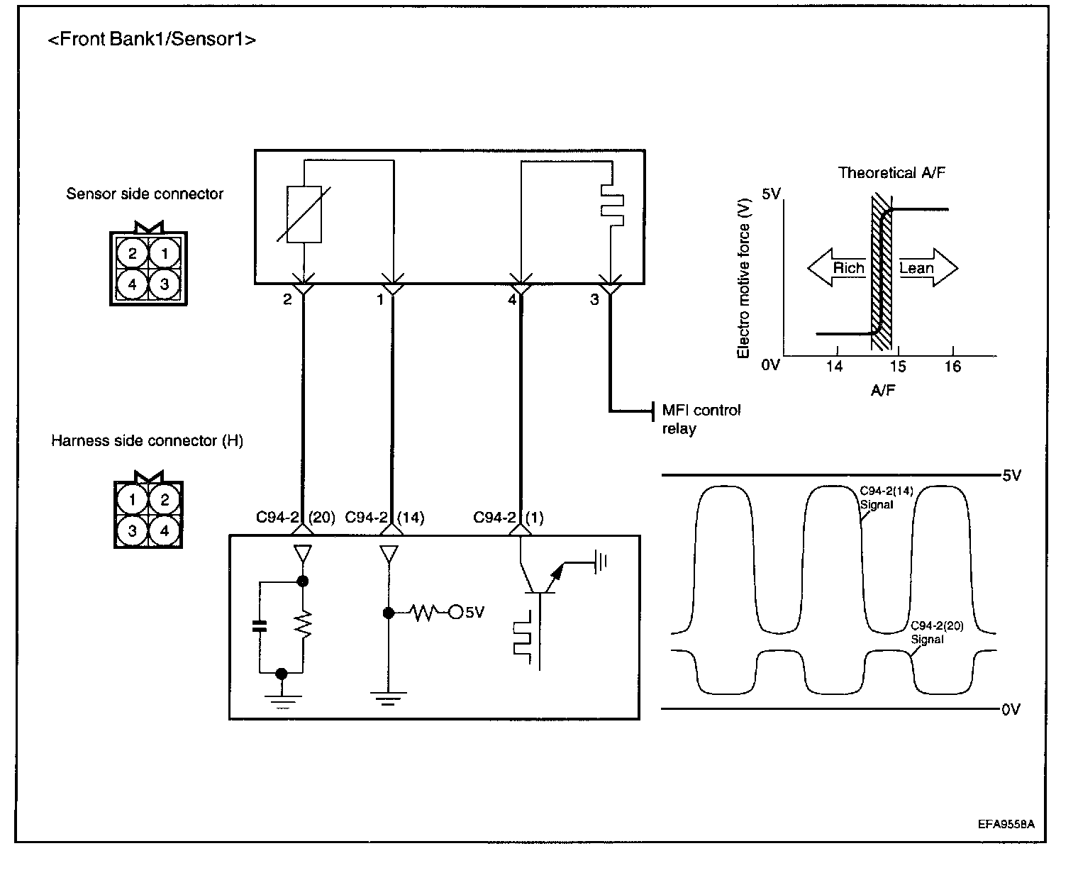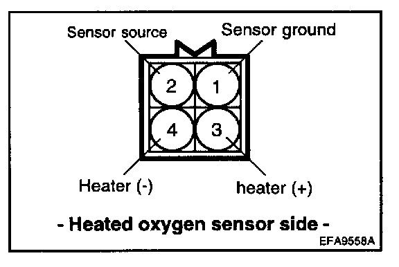 The heated oxygen sensor senses the oxygen concentration in exhaust gas, converts it into a voltage, which is sent to the ECM. The oxygen sensor outputs about 0 V when the air fuel ratio is richer than the theoretical ratio, and outputs about 5 V when the ratio is leaner (higher oxygen concentration in exhaust gas.). The ECM controls the fuel injection ratio based on this signal so that the air fuel ratio is maintained at the theoretical ratio. The oxygen sensor has a heater element which ensures the sensor performance during all driving conditions.Circuit Diagram: