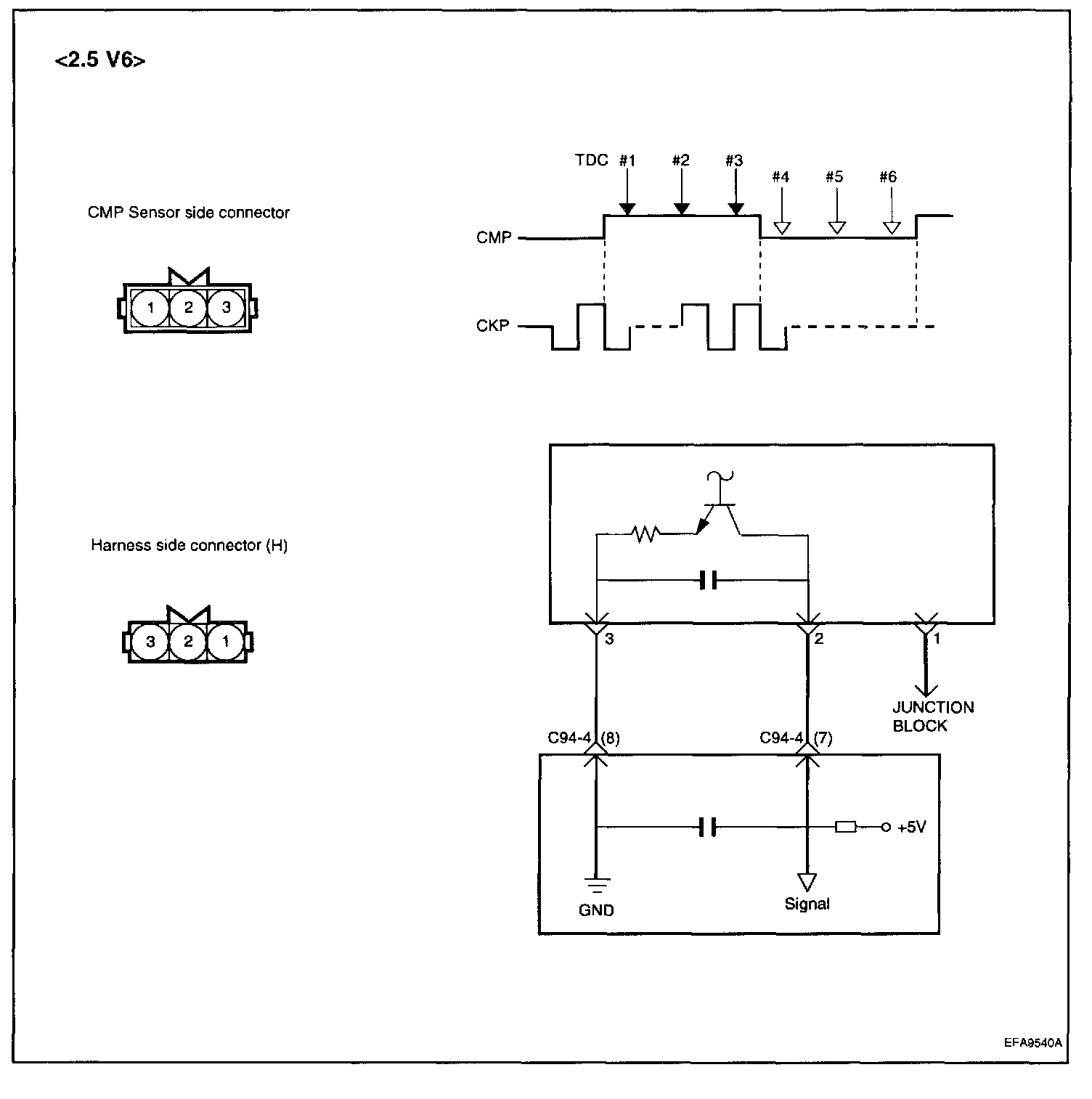 The CMP sensor senses the camshaft position sensor on compression stroke of the No.1 and No.4 cylinders, converts it into a pulse signal, and inputs it to the ECM. The ECM then computes the fuel injection sequence, etc. based on the input signal.Circuit Diagram: