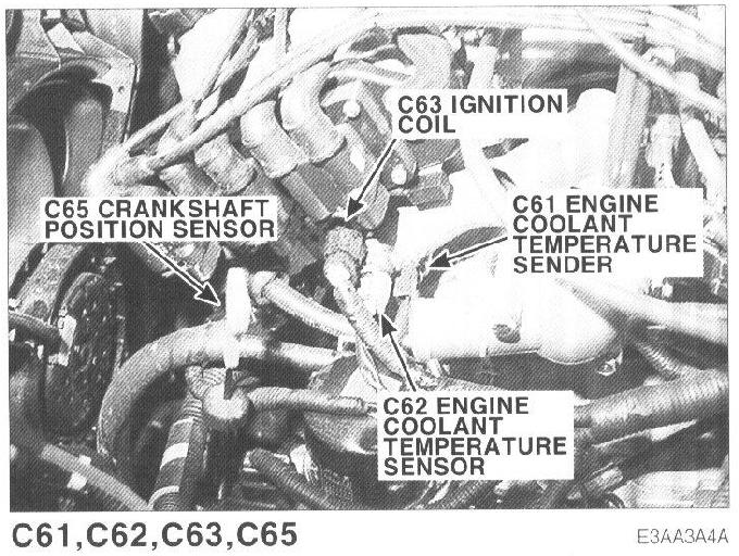 C61 Engine Coolant Temperature Sender, C62 Engine Coolant Temperature Sensor, C63 Ignition Coil, C65 Crankshaft Position Sensor 2.5 L: