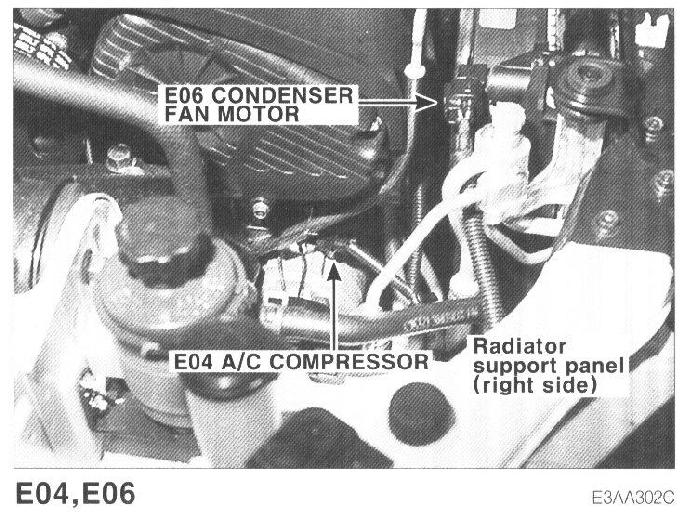 E04 A/C Compressor, E06 Condenser Fan Motor:
