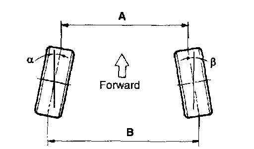 Toe-in (B - A or angle a + b) is adjusted by turning the tie rod turnbuckles. Toe-in on the left front wheel can be reduced by turning the tie rod toward the rear of the car. Toe change is achieved by turning the tie rods for the right and left wheels simultaneously the same amount as follows: