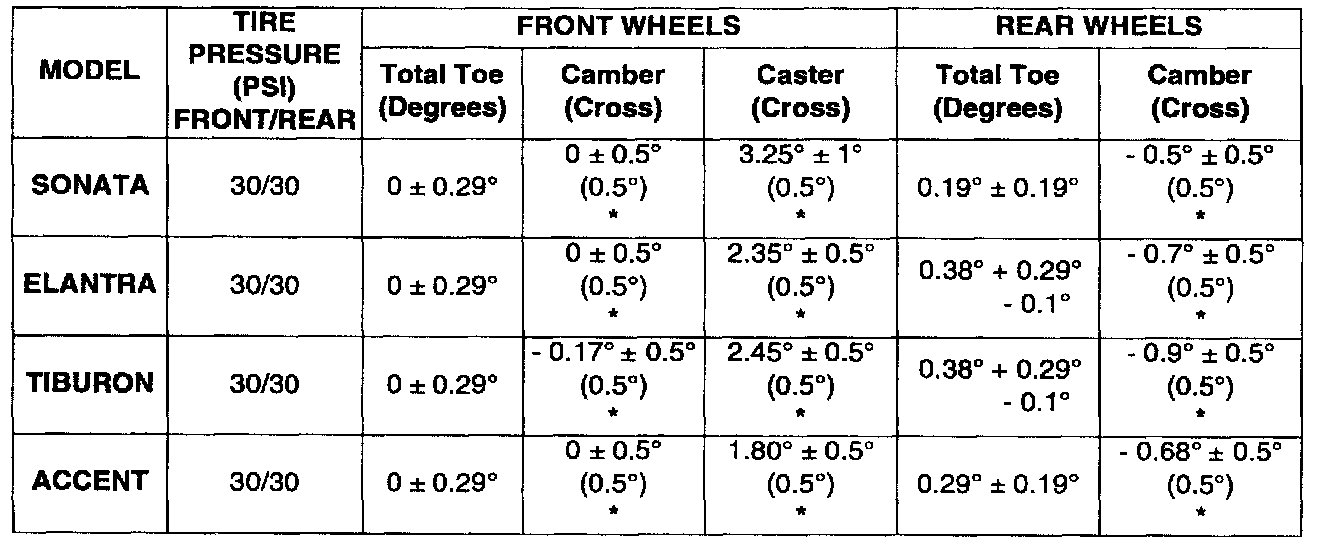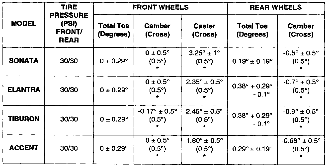 1999 MODEL YEAR ALIGNMENT SPECIFICATIONS (DEGREES) CHART: