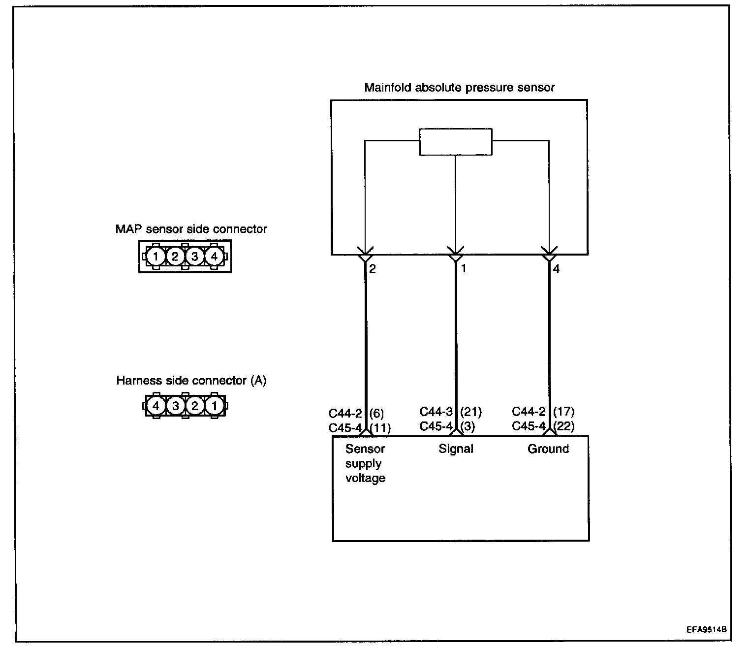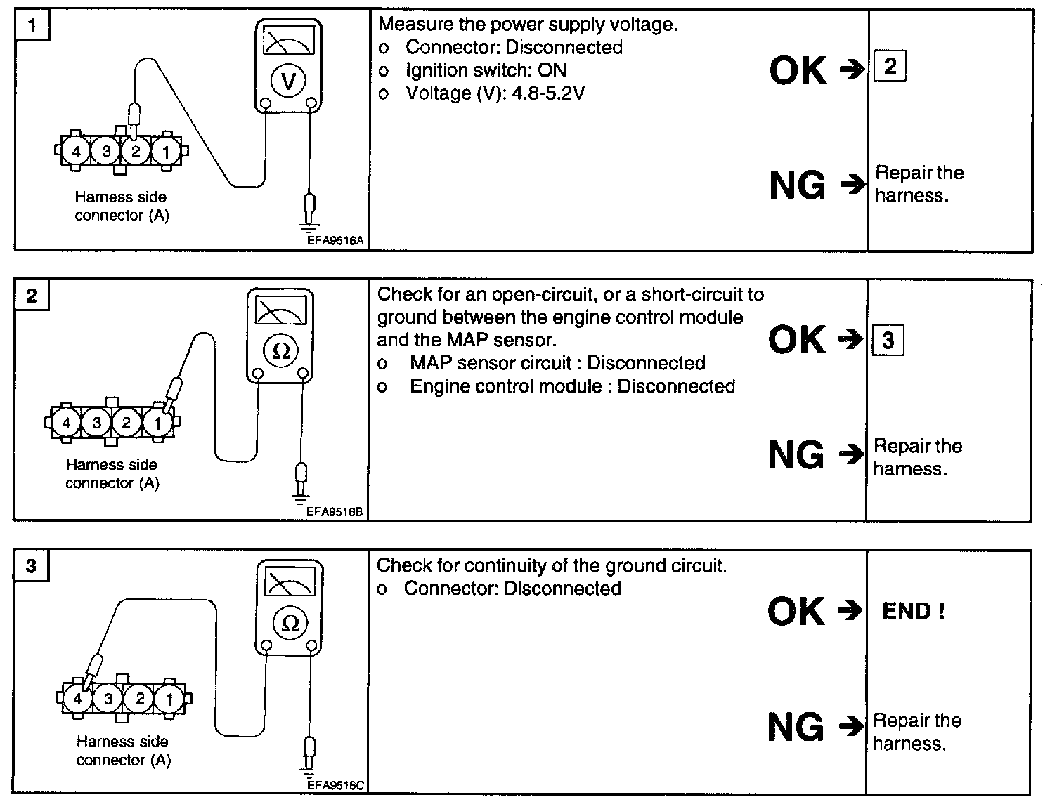 1. Connect the voltmeter between 1 and 4 of MAP sensor connector for