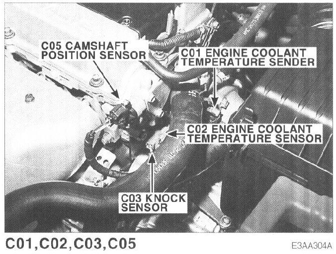 C01 Engine Coolant Temperature Sender, C02 Engine Coolant Temperature Sensor, C03 Knock Sensor, C05 Camshaft Position Sensor: