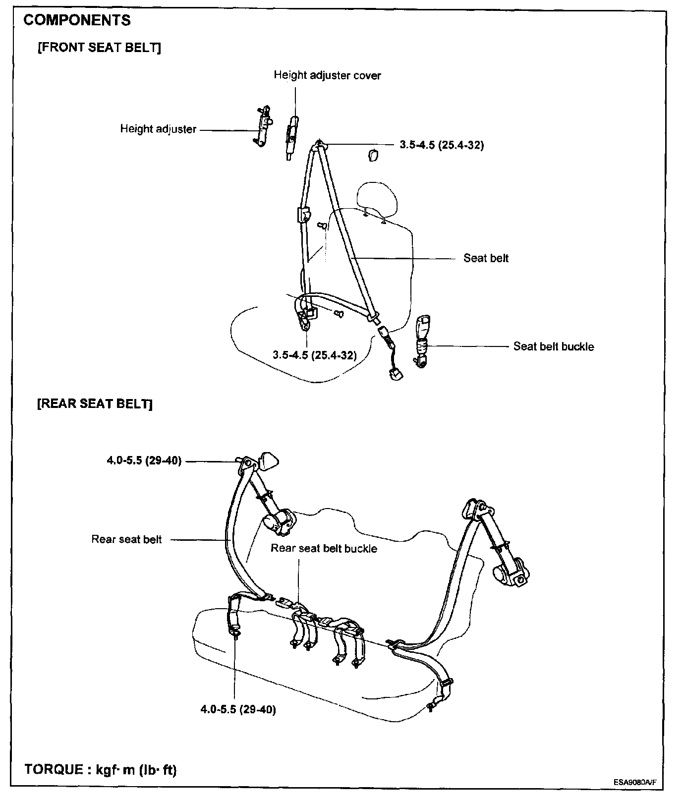Seat belt buckle: 4.0 - 5.5 kg.m (29 - 40 lb.ft)