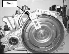 Remanufactured transaxles are shipped with a retaining strap to hold the torque converter in place. Do not remove the strap until the transaxle is mounted on the transmission jack and ready for installation.