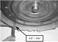If the torque converter has moved from the fully inserted position, carefully push inward and rotate the torque converter until the converter is recessed approximately 1/2"-3/4" into the transaxle case.