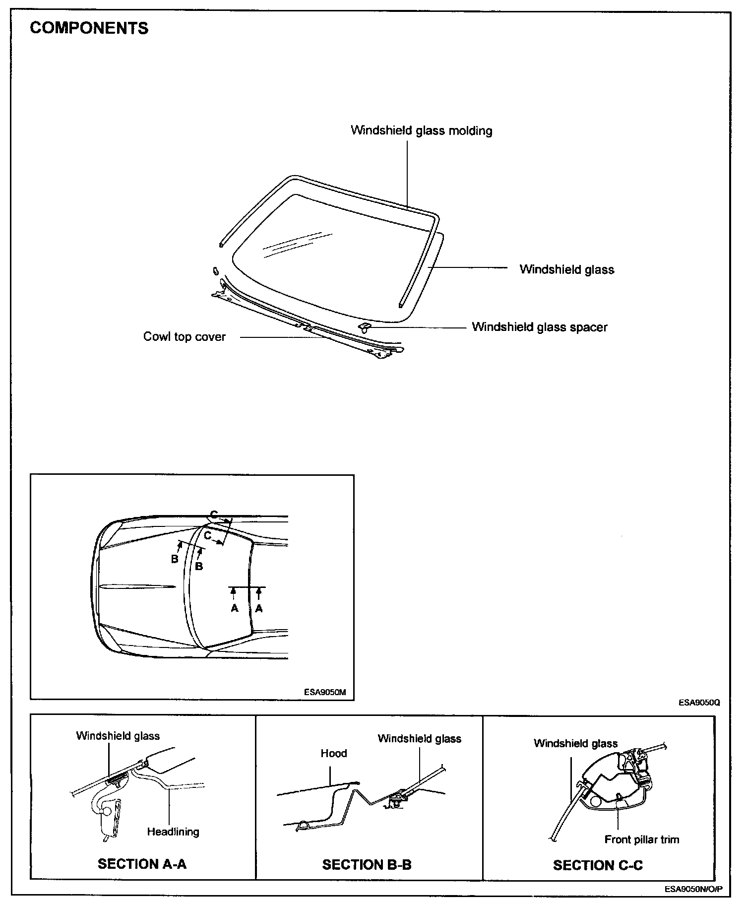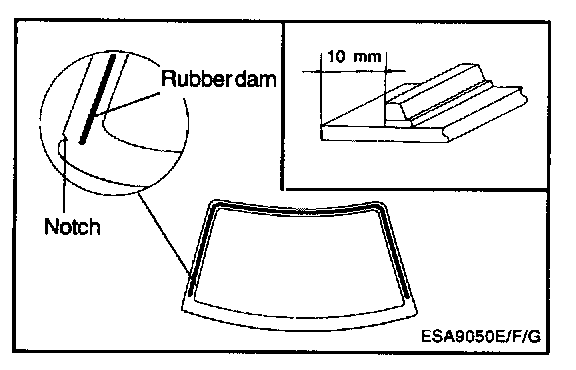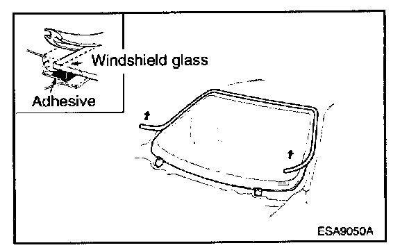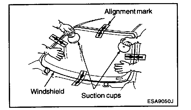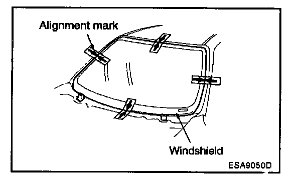 4. When replacing the glass, temporarily set the glass against the body, and place mating marks on the glass and body. Use unleaded petrol to degrease the inside and outside of the windshield glass and the body flanges.