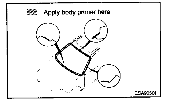 7. Apply the light coat of body primer to the original sealant remaining around the body flange. The glass should be installed 10 minutes after you apply the primer.