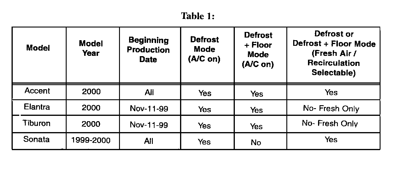 Elantras and Tiburons produced before November 11,1999 are equipped with a system that requires manually selecting the "A/C" for additional dehumidifying action. Additionally, the fresh air / recirculation mode can be controlled in all of the air direction modes.