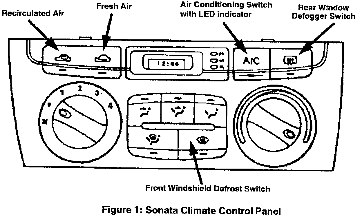 For the Elantra and Tiburon, the Fresh Air / Recirculation mode control is also controlled by the DEFROST and DEFROST/FLOOR mode control. When DEFROST or DEFROST/FLOOR mode is selected, the Fresh Air / Recirculation mode control switches to Fresh Air (regardless of switch position) and remains there until the directional mode control is FACE, FACE-FEET, or FEET mode.