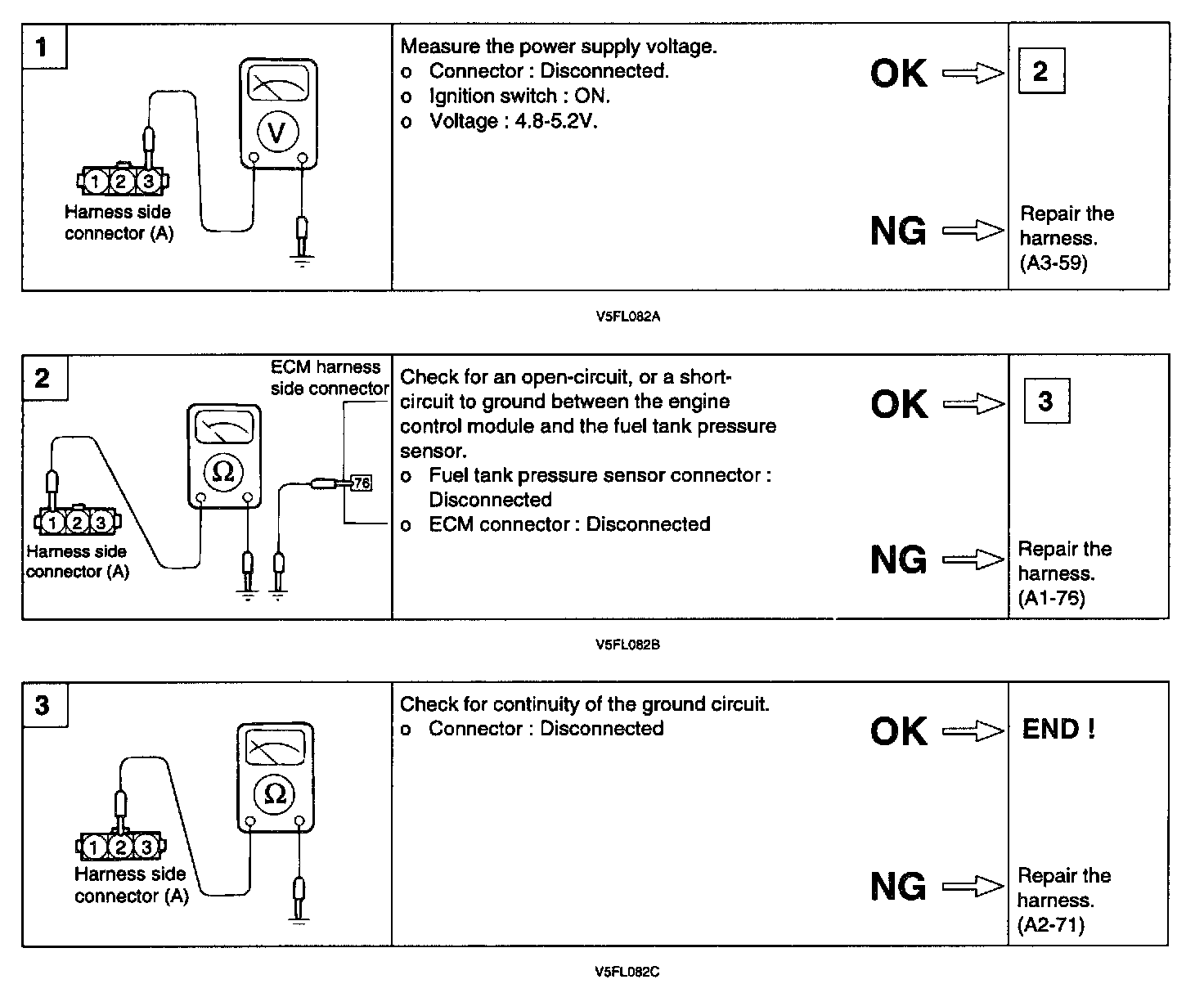 NOTE: If voltage is not within spec as procedures, there is leakage and inspect the fuel tank and hoses toward canister and fuel neck. Then repair or replace relevant parts.