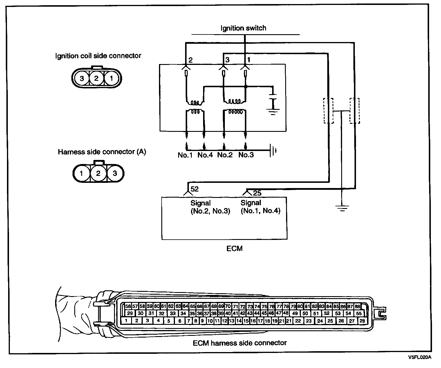 When the ignition power transistor is turned ON by the signal from the ECM. It sends the signal to the ignition coil, then primary current is shut off and a high voltage is induced in the secondary coil.