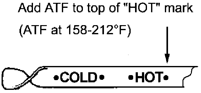 ^ Place the shift lever in "Neutral" and check the ATF level on the dipstick. Add SPIII ATF to bring the level to the top of the "FULL" mark.