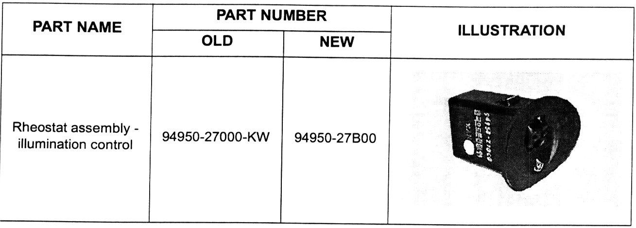 A new rheostat assembly has been made available to correct this condition. If a Tiburon vehicle produced between May 16, 1997 and September 7, 2001 experiences the flickering condition, replace the rheostat assembly with the new part number.
