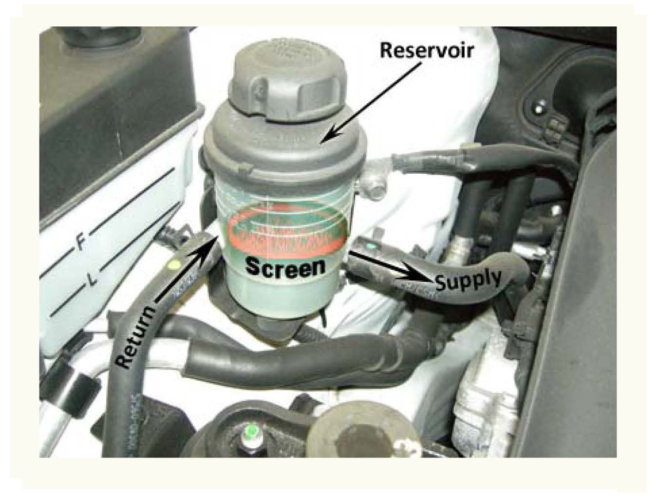 For proper inspection of the screen, it may be necessary to empty the power steering oil pump reservoir.