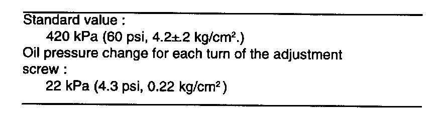 Oil pressure change for each turn of the adjustment screw: 30 kPa (3 psi, 0.3 kg/cm2)