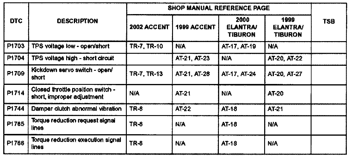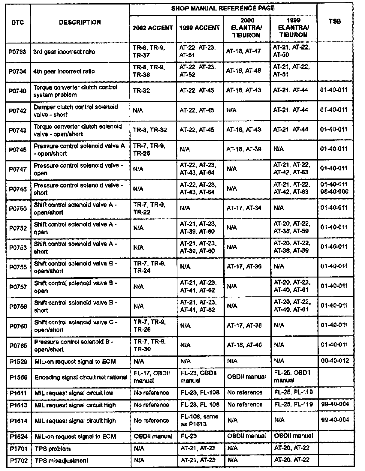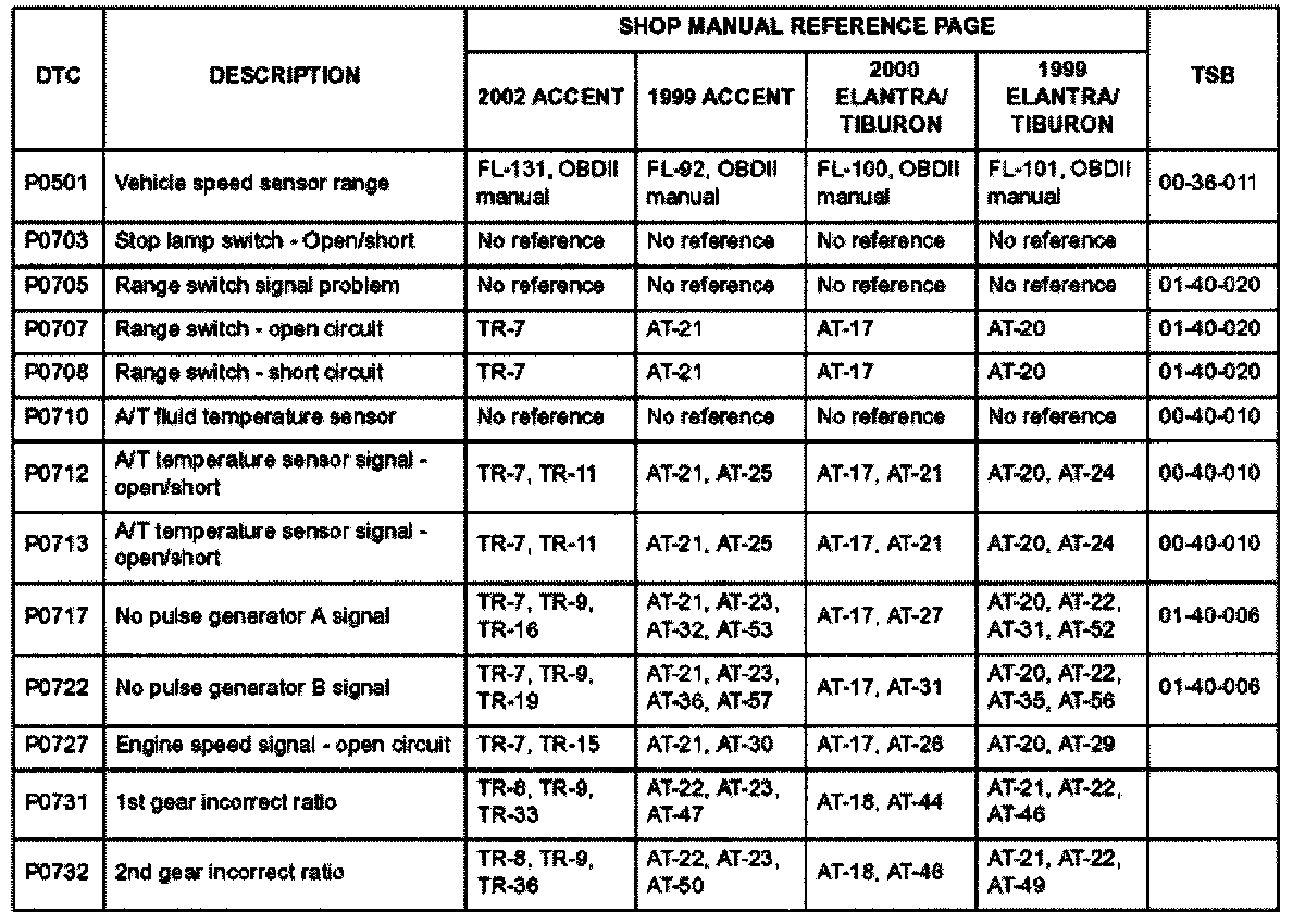 1996-2002 Accent, 1996-2000 Elantra and 1997-2001 Tiburon vehicles share common transaxle diagnostic trouble codes (DTC). Elantra and Tiburon vehicles beginning with June 1, 1999 production and 2000-2001 Accent vehicles use a valve body with six solenoids and have several new DTCs.