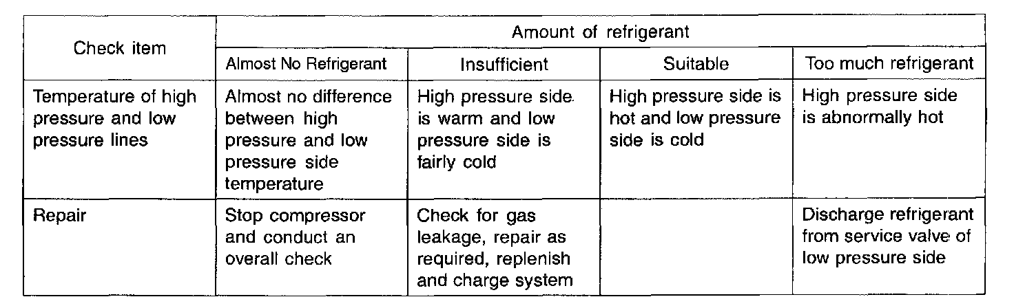 5. After about five minutes, check whether the amount of refrigerant is proper or insufficient according to the table.
