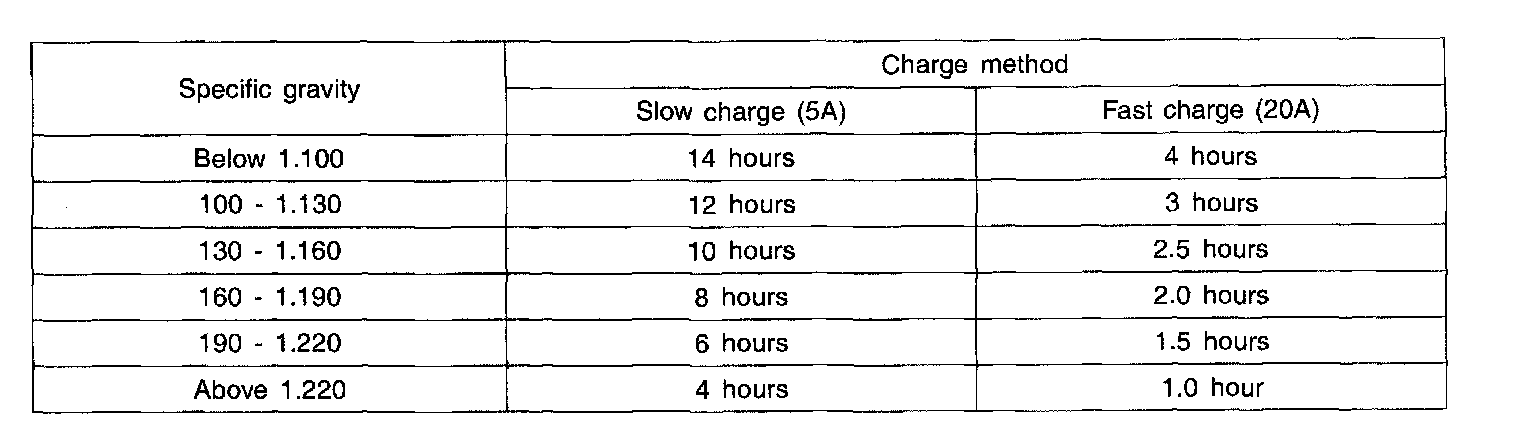 A fully charged battery should have a specific gravity between 1.260 and 1.280, with the electrolyte temperature at 26.7 °C. The specific gravity reading must be corrected by adding 4 points (.004) for each 5.56 °C above 26.7 °C or subtracting 4 points for every 5.56 °C below 26.7 °C.