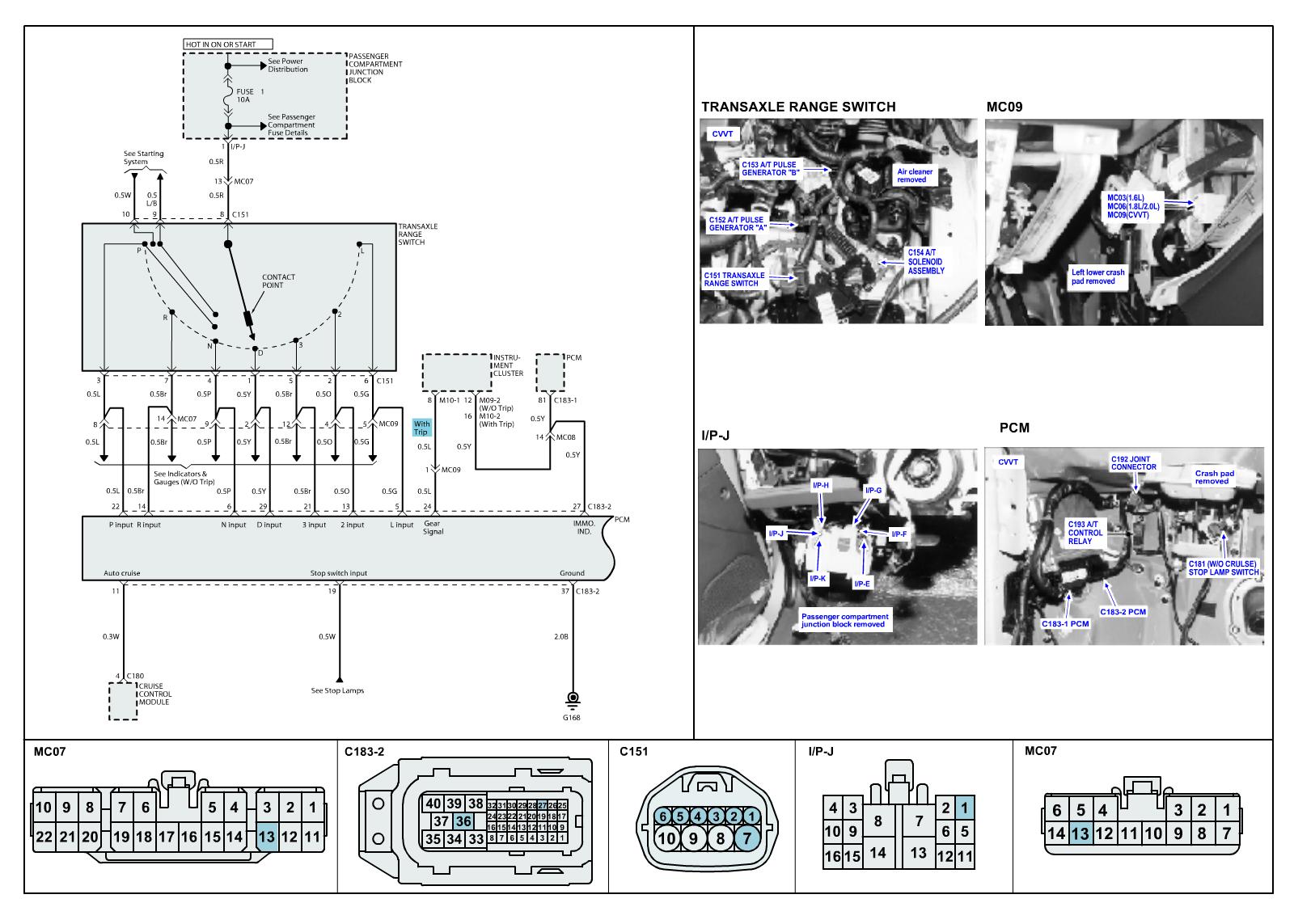 The Transaxle Range Switch sends the shift lever position information to the TCM using a 12V (battery voltage) signal. When the shift lever is in the D (Drive) position the output signal of Tansaxle Range Switch is 12V and in all other positions the voltage is 0V. The TCM judges the shift lever position by reading all signals, for the Transaxle Range Switch, simultaneously.