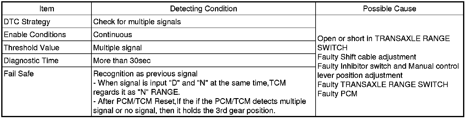 The PCM/TCM sets this code when the Transaxle Range Switch outputs multiple signals for more than 30 seconds.