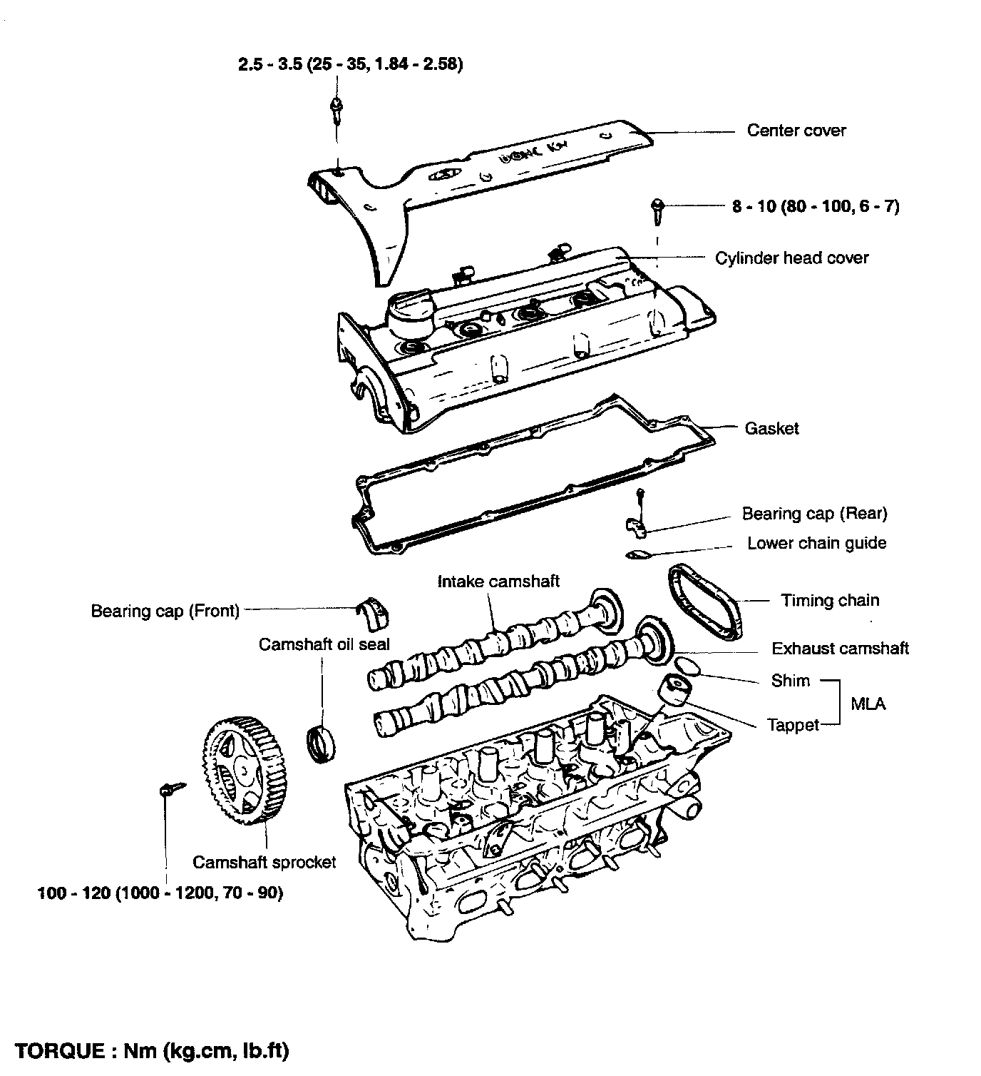 Camshaft sprocket bolt: 100 - 120 Nm (1000 - 1200 kg.cm, 74 - 89 ft. lbs.)