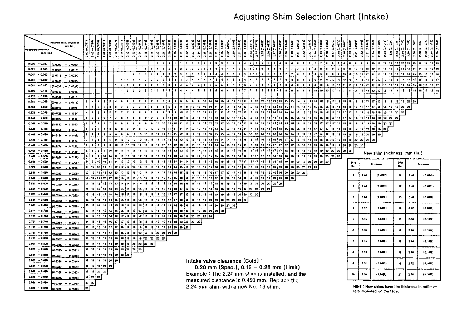 Intake - Adjusting Shim Selection Chart