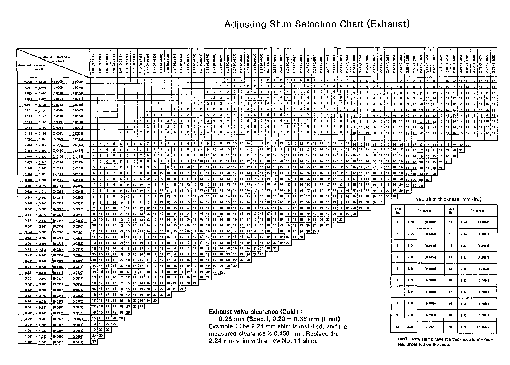 Exhaust - Adjusting Shim Selection Chart