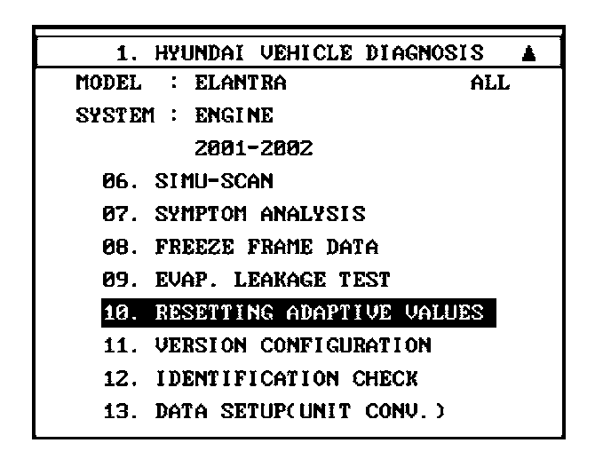 5. Choose menu number 10 for "RESETTING ADAPTIVE VALUES."