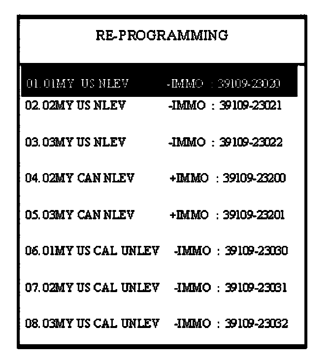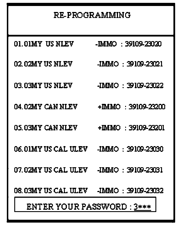 6. Select the correct password for the manual update mode which is correct for the vehicle specification by referring to the chart. Then press ENTER.