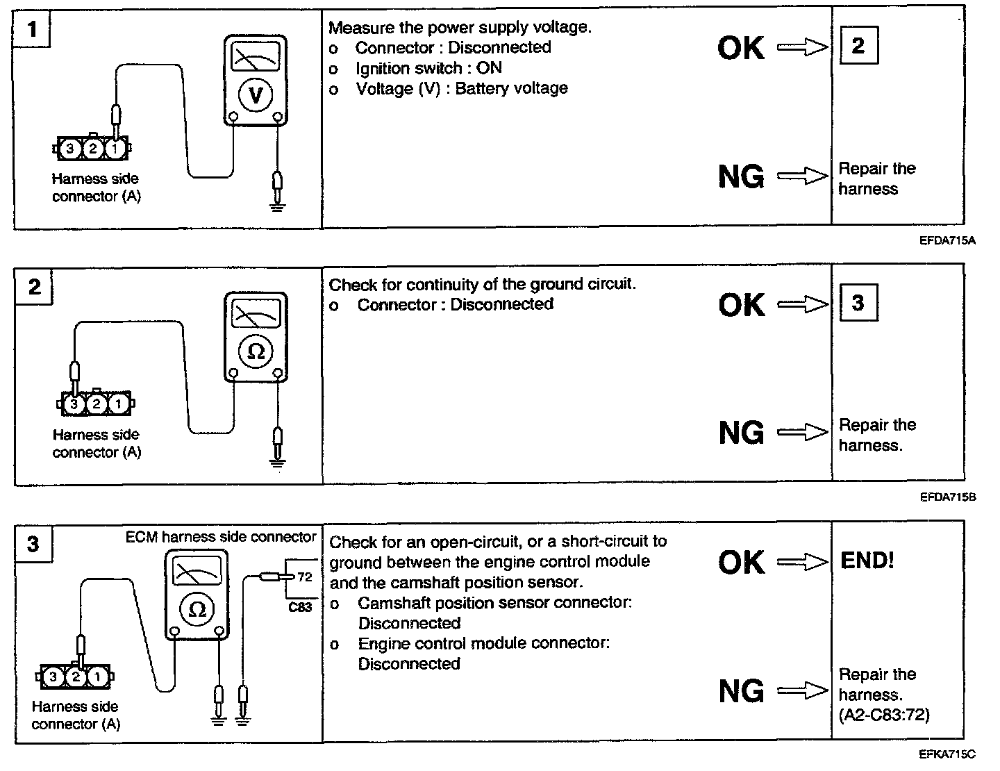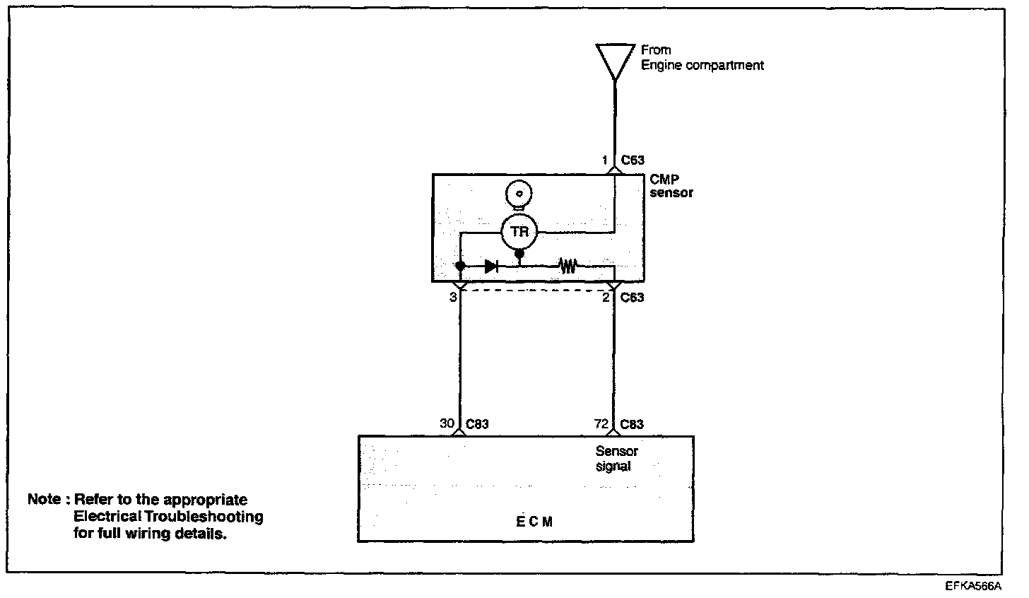 The camshaft position sensor (CMP Sensor) senses the TDC point of No.1 cylinder on its compression stroke. Its signal is fed to the ECM to be used to determine the sequence of fuel injection.