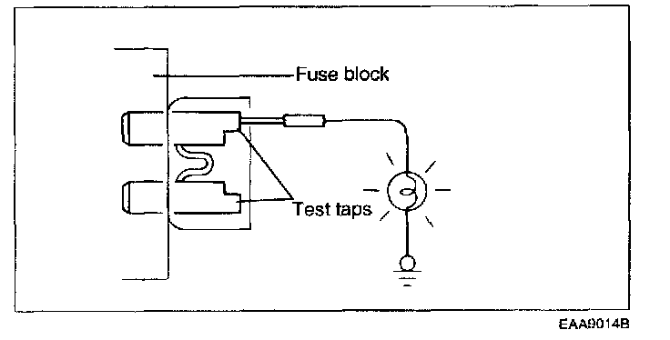 A blade type fuse has test taps provided to allow checking the fuse itself without removing it from the fuse block. The fuse is good if the test lamp tights up when one lead is connected to the test taps (one at a time) and the other lead is grounded. (Turn the ignition switch so that the fuse circuit becomes operative.)