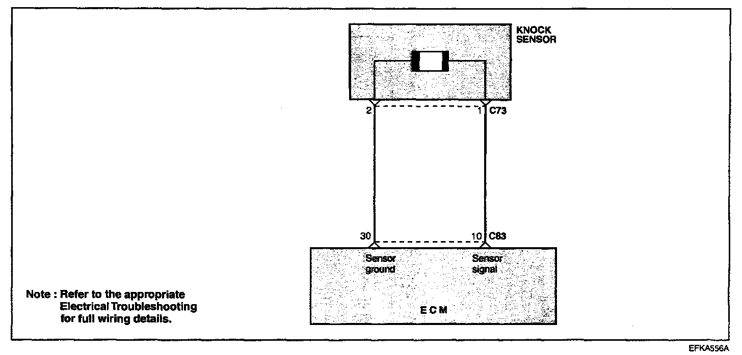 The knock sensor is attached to the side of the cylinder block to sense engine knocking. A knocking vibration from the cylinder block is applied as pressure to the piezoelectric element. This vibrational pressure is then converted into a voltage signal which is relayed to the ECM. If engine knocking occurs, ignition timing is retarded to suppress it.