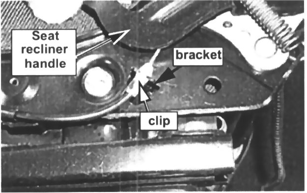 12. Lift up on the seat recliner handle and pull the recliner cable clip out of the recliner cable holding bracket welded to the seat track.