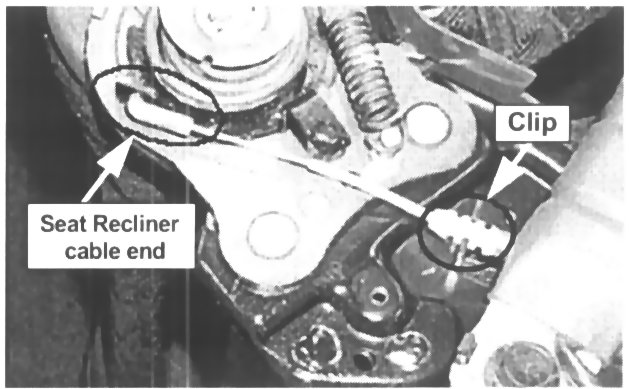 17. Remove the seat recliner cable end out of the hole in the recliner.