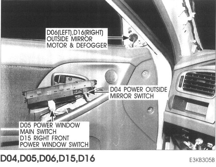 D04 Power Outside Mirror Switch, D05 Power Window Main Switch, D06 Left Outside Mirror Motor And Defogger, D15 Right Front Power Window Switch, D16 Right Outside Mirror Motor And Defogger: