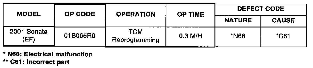 Some 2001 Model Year Sonatas with 2.4L DOHC engines and automatic transaxles were produced with Transaxle Control Modules (TCM) that do not properly diagnose and display diagnostic trouble codes (DTC) for some functions.