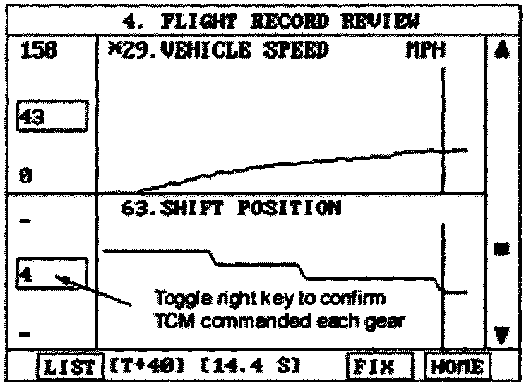 Toggle the left and right keys to measure the start and end of each shift, then subtract the two numbers. If any shift requires more than 2.0 seconds, swap a TCM from a properly operating vehicle: